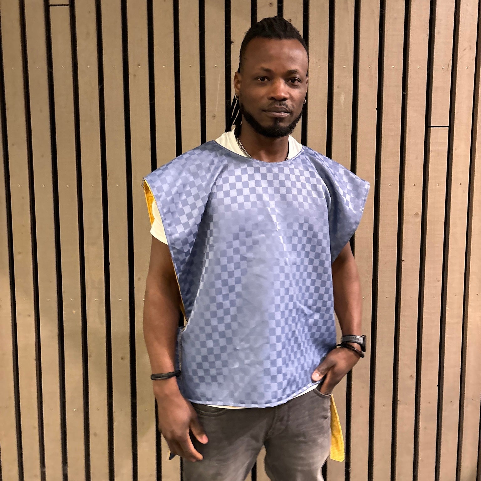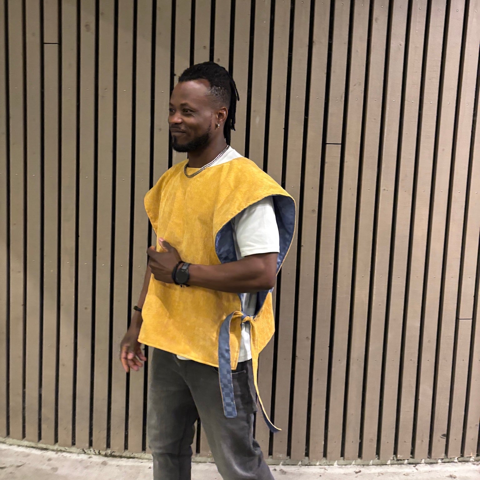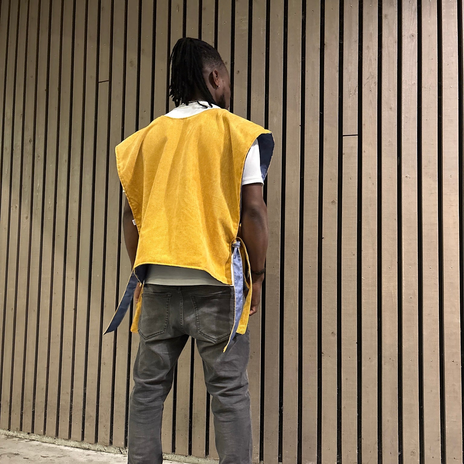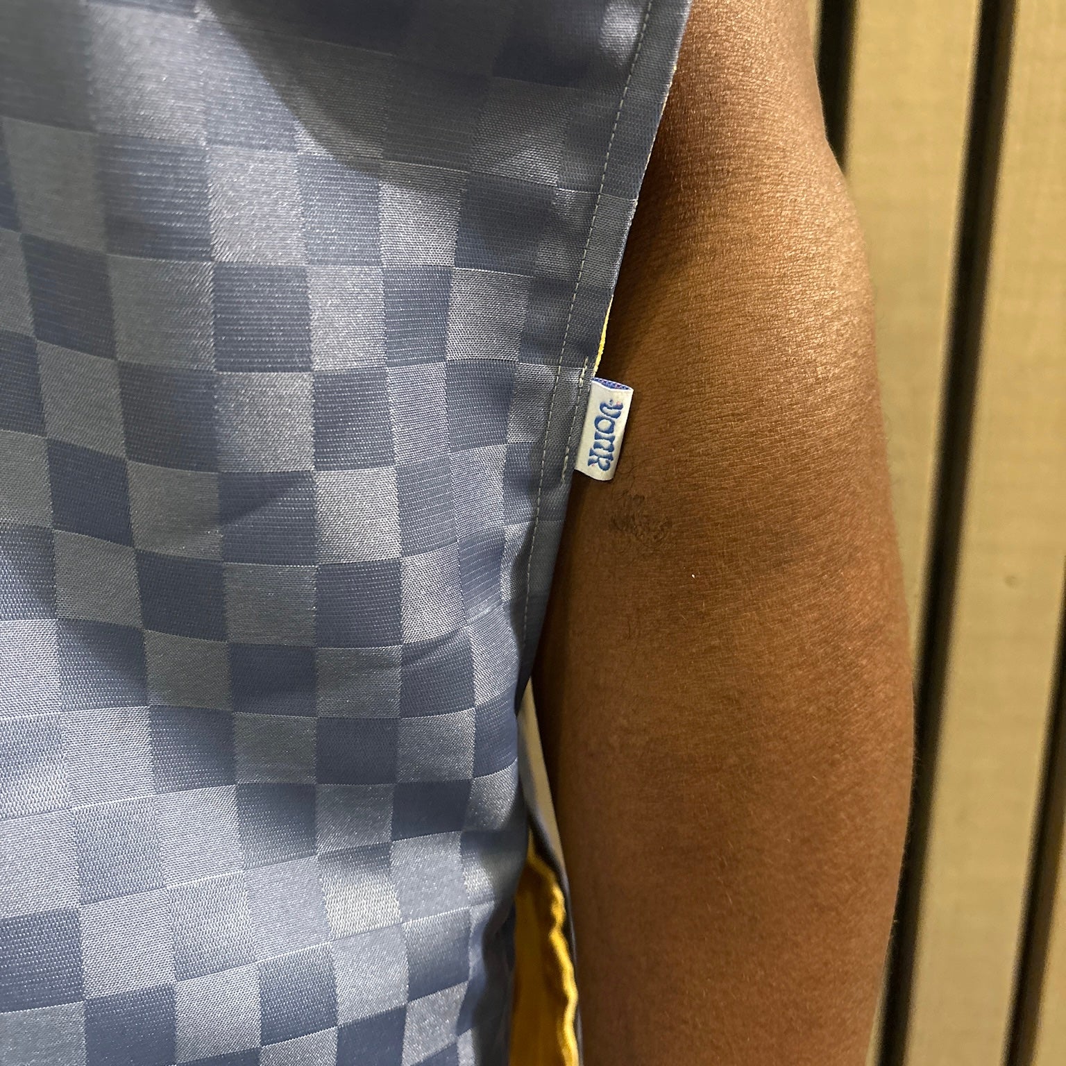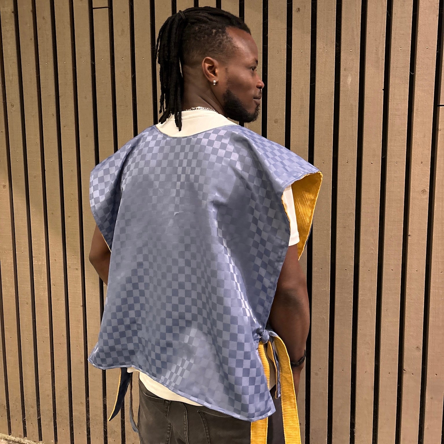 A reversible top designed for flexibility and contrast. One side features a shiny checkered tablecloth. Flip it inside out to reveal a bright yellow side, made from a thrifted curtain. The adjustable ties can be worn at the side or in the front and back, allowing you to change the fit and silhouette. One piece, multiple ways to wear it.