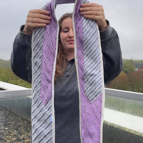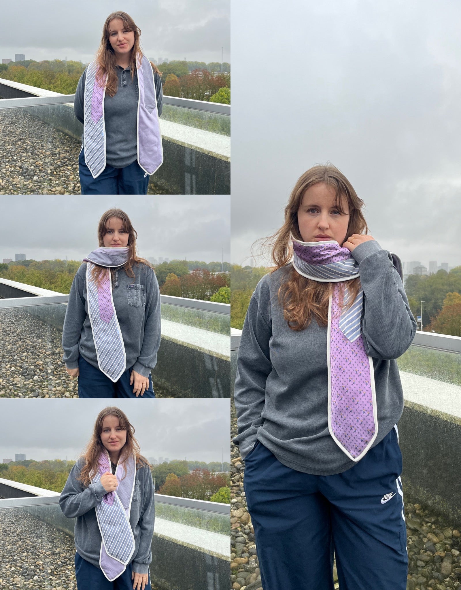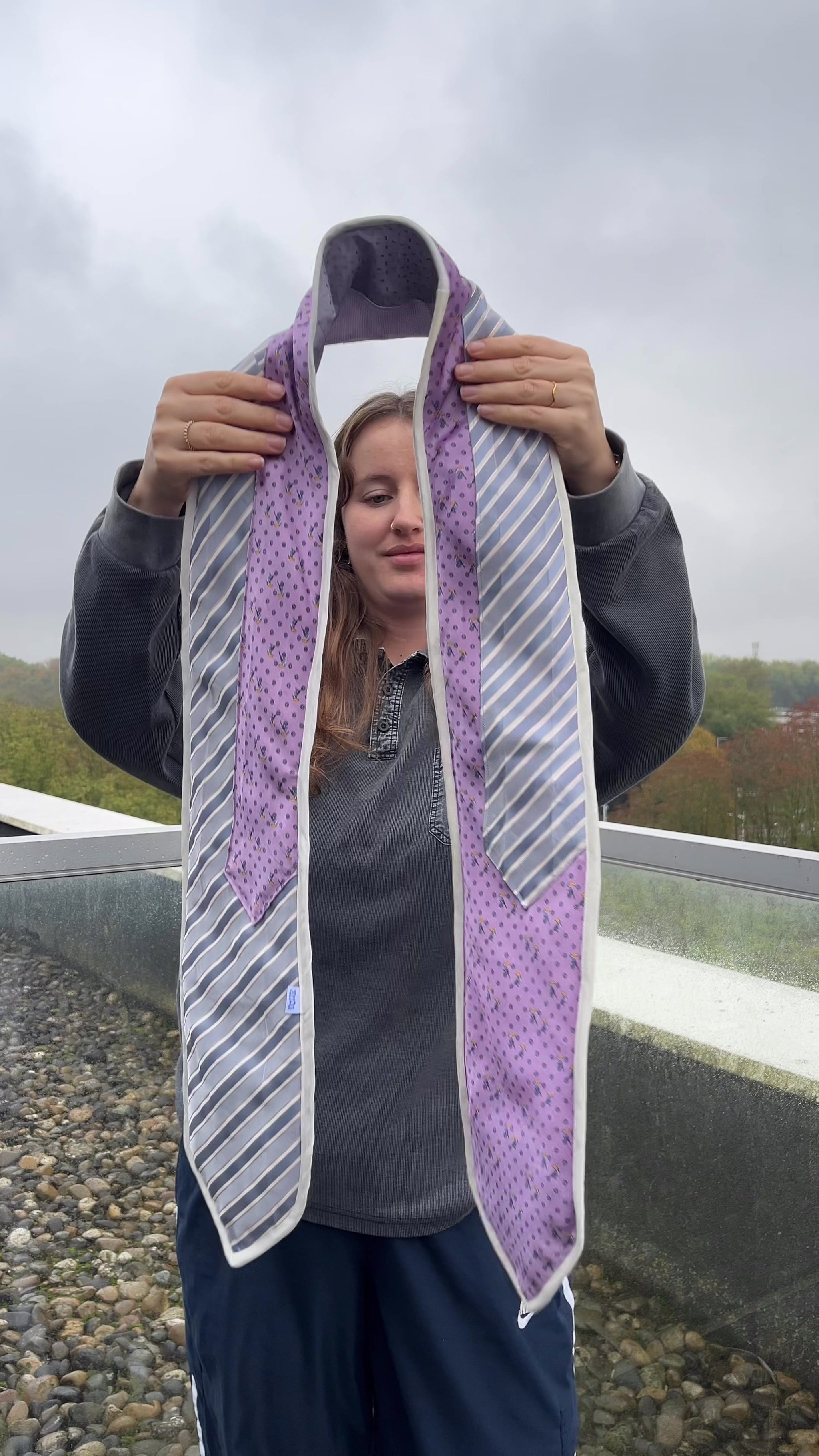 Business meets streetwear. This upcycled scarf is made from thrifted ties, keeping their original shape and patterns visible. A bold mix of textures and stories.